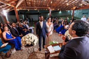 Para os casais que desejam realizar a cerimônia no local da festa ou buscam um formato mais autoral, a escolha de um celebrante profissional é uma excelente alternativa. Ele pode ou não ter vínculo religioso e atua conduzindo cerimônias simbólicas, afetivas e altamente personalizadas.